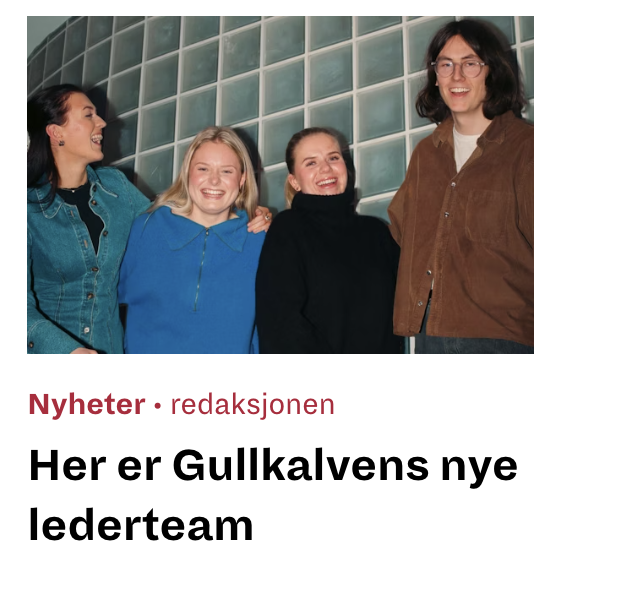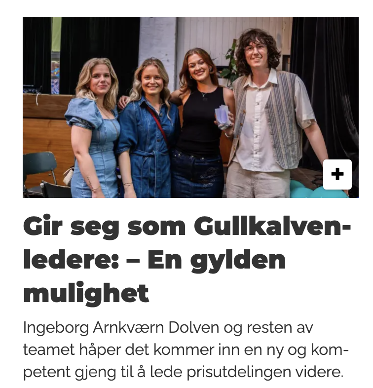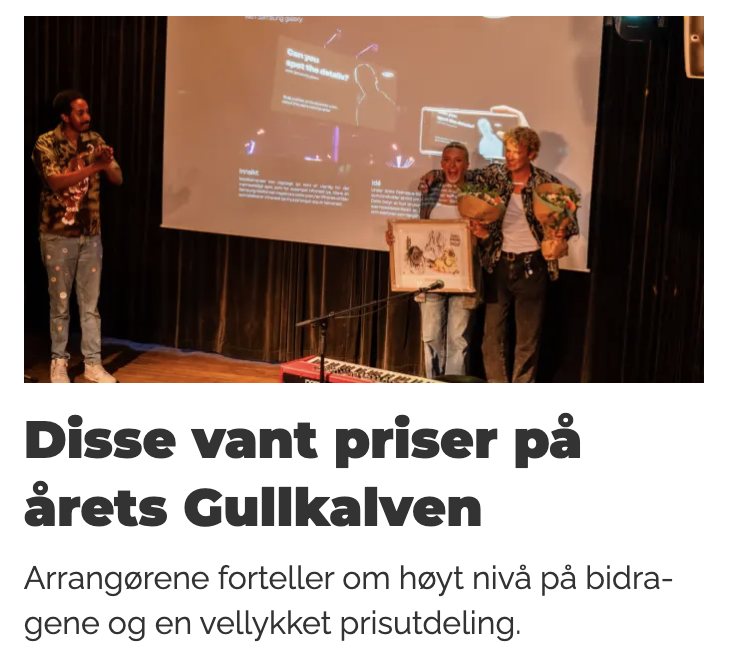I 2024 hadde jeg gleden av å være en av lederne for Gullkalven, Norges største studentkonkurranse innen kreativ kommunikasjon. Som ansvarlig for gjennomføringen av prisutdelingen hadde jeg en bred rolle som omfattet planlegging og koordinering av hele arrangementet. Dette inkluderte blant annet å sikre en passende lokasjon, engasjere artister, lage presentasjoner, organisere juryarbeidet, håndtere budsjetter, samt stå for kommunikasjon og pressekontakt. Denne erfaringen ga meg verdifull innsikt i prosjektledelse og evnen til å håndtere komplekse arrangementer fra start til slutt.